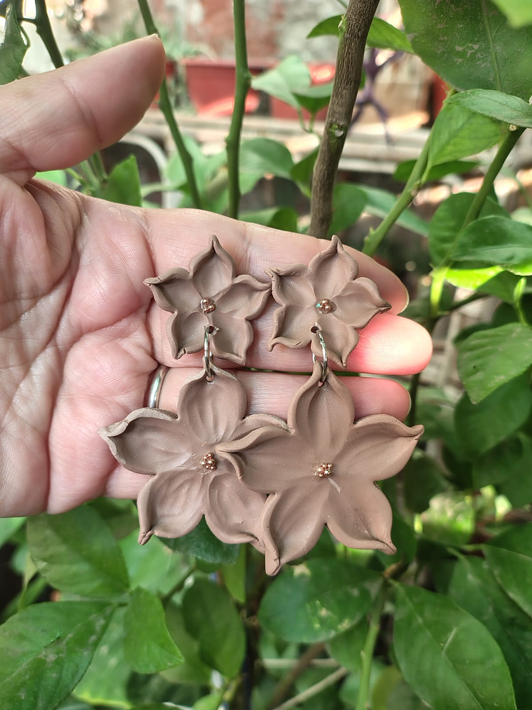 Aritos en forma de flor en arcilla polimerica en color beige con base de acero inoxidable