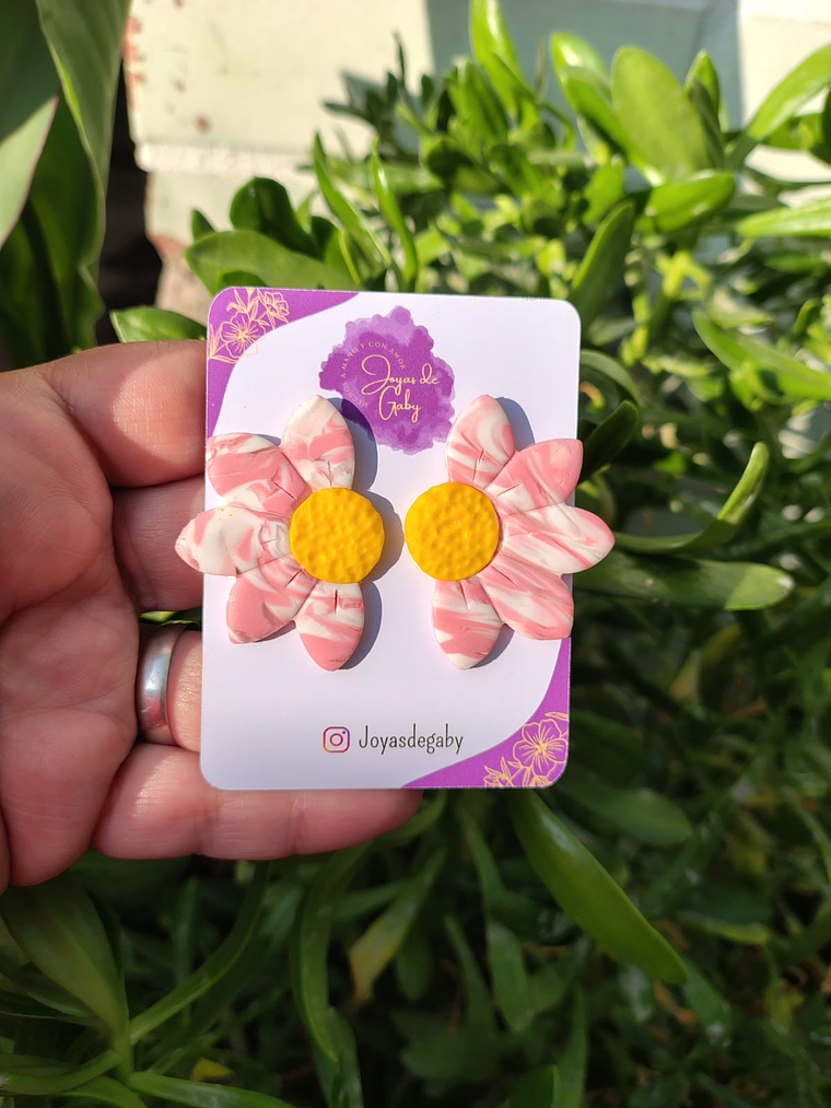Arito en forma de flor en arcilla polimerica color rosa con base de acero inoxidable.
