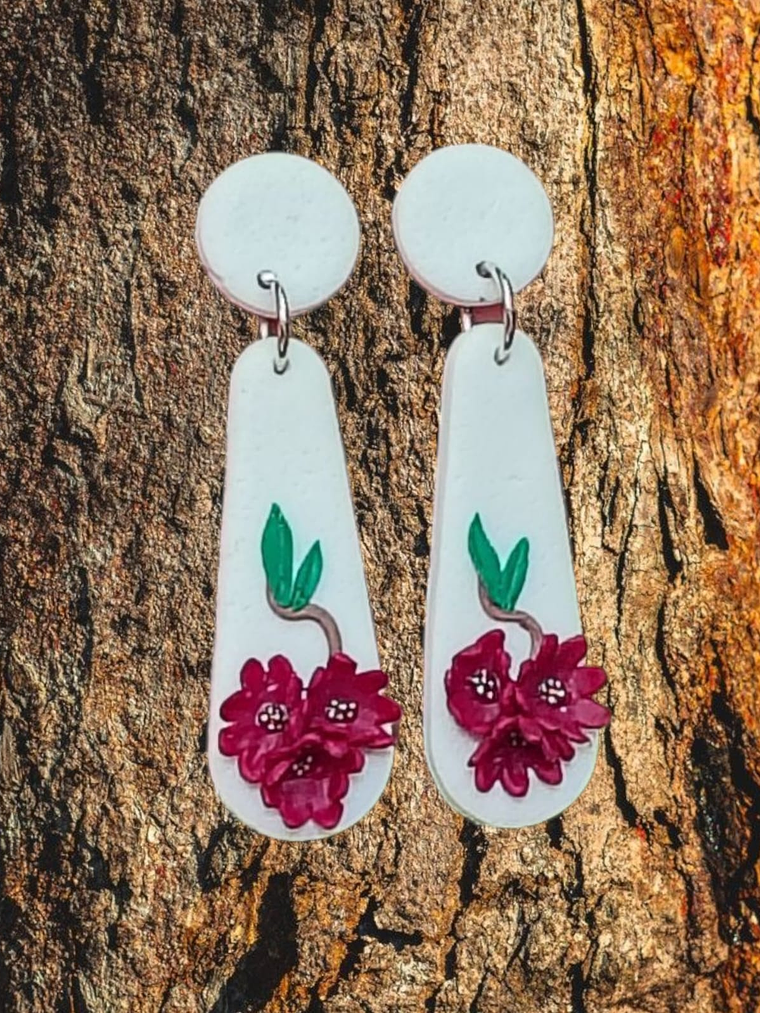 Aritos modelo Liliana en arcilla polimerica Blancos con flores burdeos con base de acero inoxidable.
